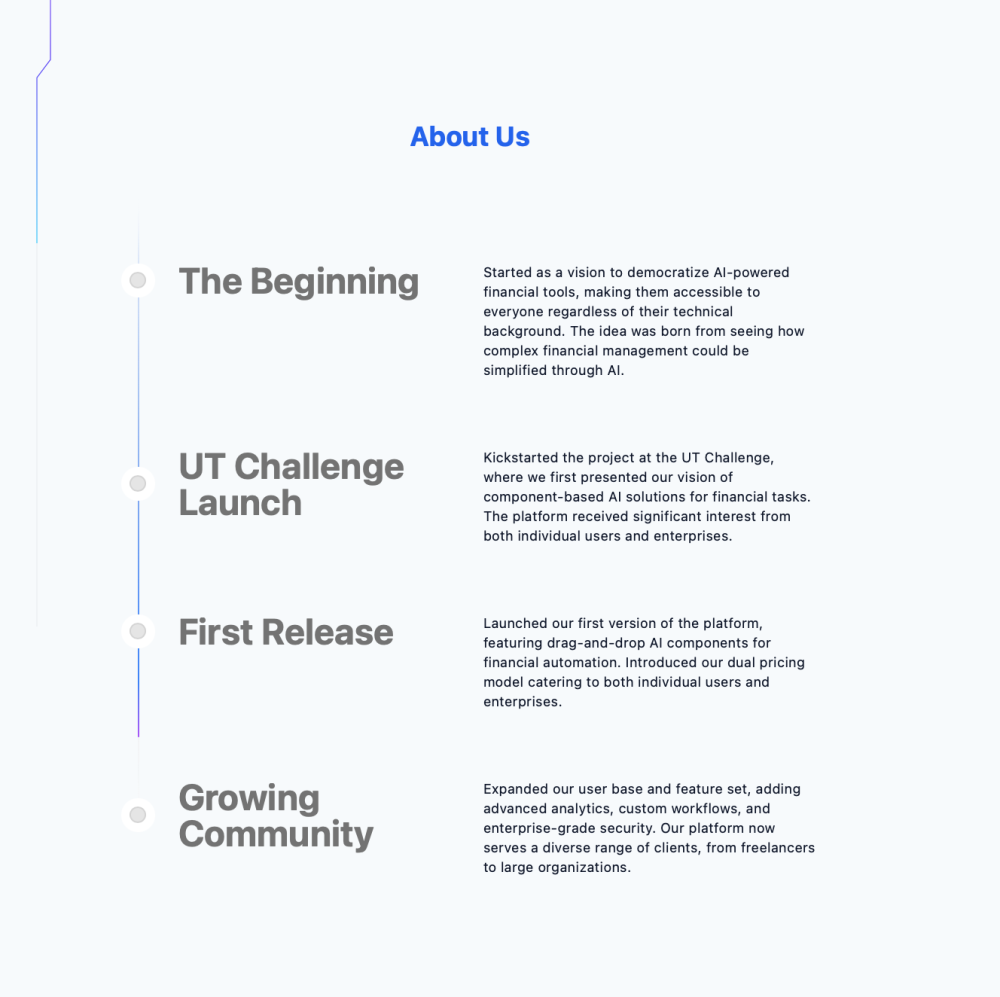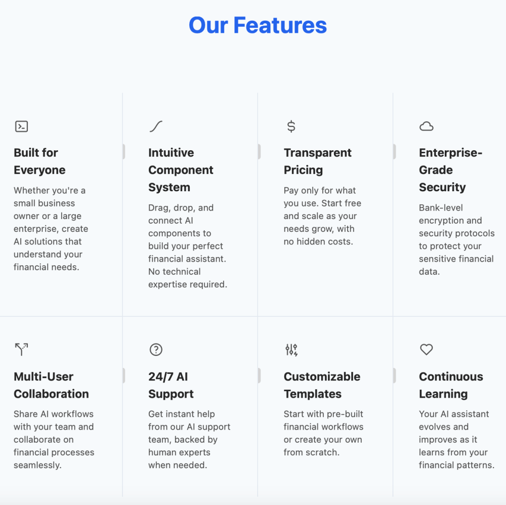 41% of fintech startups struggle to measure the value of AI initiatives. Deloitte's 2025 Banking Industry Outlook mentions that “Modular AI architecture and composable tools will be critical to scaling personalized financial services.”. Complexity and cost barriers of fintech are growing faster than ever, alongside the growing need for automation tools without internal team experience. Given the fast adaptation of AI agents of big financial companies and institutions, smaller firms are left behind in this race. Currently, only big corporations can afford to build performant AI agents that precisely suit their needs. Available tools are too generic or too proprietary, with rigid APIs and fragmented tooling. Most available tools require a high level of developer dependency, otherwise, the company must hire an external outsourcer. However, AI consultancy is still untrustworthy, and there is a lack of a systematic way of choosing and evaluating AI workflows.