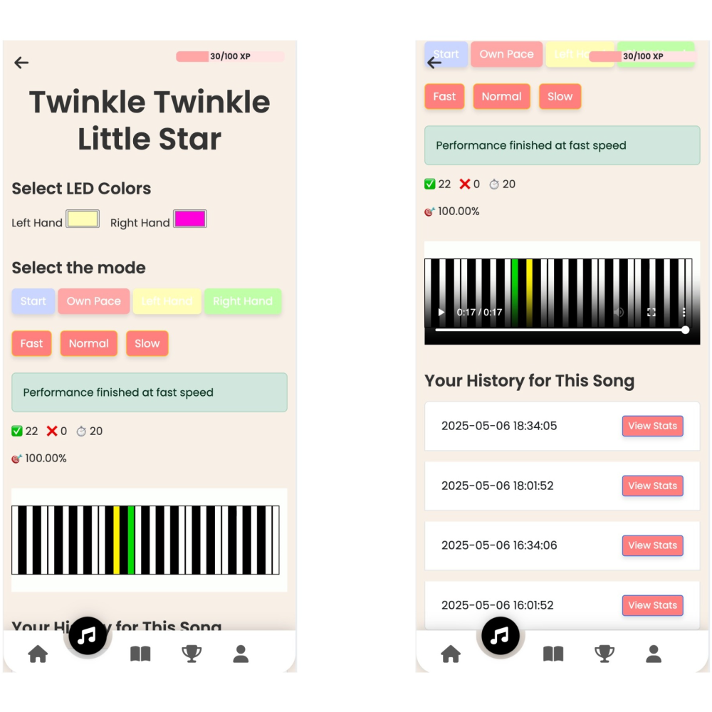 The LED-Guided Piano Project is a creative and user-friendly way to learn piano, designed especially for beginners and intermediate players. By placing LEDs directly above the keys, the system visually guides learners by highlighting the notes to play, making the learning process intuitive and fun. This method helps build confidence, improves hand-eye coordination, and speeds up the recognition of note patterns and sequences. Alongside the LED hardware, there's a companion app that enhances the learning experience by offering useful insights, performance statistics, and immediate feedback. The app records your sessions and lets you replay them as videos showing exactly which keys you've pressed. You can practice at your own pace or with different modes such as fast, normal, slow, or even focus specifically on just the right or left hand. There is also a mode that gives you the opportunity to learn where notes are situated on the keyboard. Additionally, the app incorporates engaging gamification elements like achievements, experience points, and levels, which motivate users by rewarding progress and milestones. This helps learners visually understand their playing, spot mistakes, and track improvements over time. Users can set personal goals and monitor their progress, turning practice into an enjoyable and motivating activity. Together, the LED-Guided Piano and the app offer an engaging, accessible, and effective way to master piano playing at your own pace.